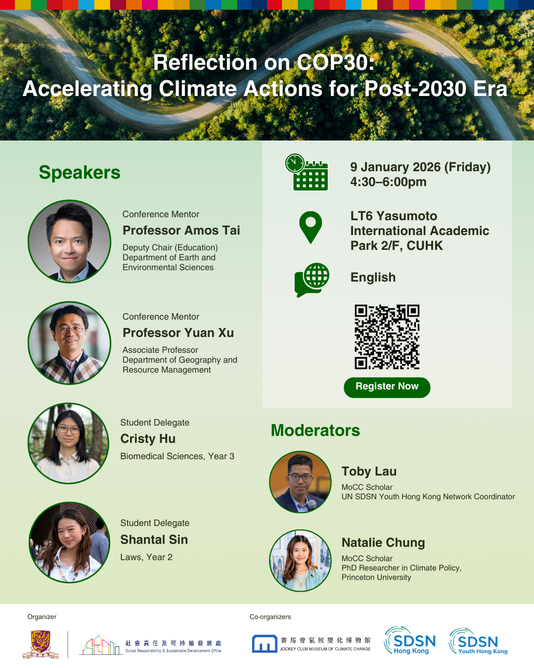 CUHK professors and student delegates have returned from COP30. They are eager to share their takeaways from the conference and their vision for climate action at the session, ‘Reflection on COP30: Accelerating Climate Actions for the Post-2030 Era’. All CUHK students, staff and the public are welcome to join.